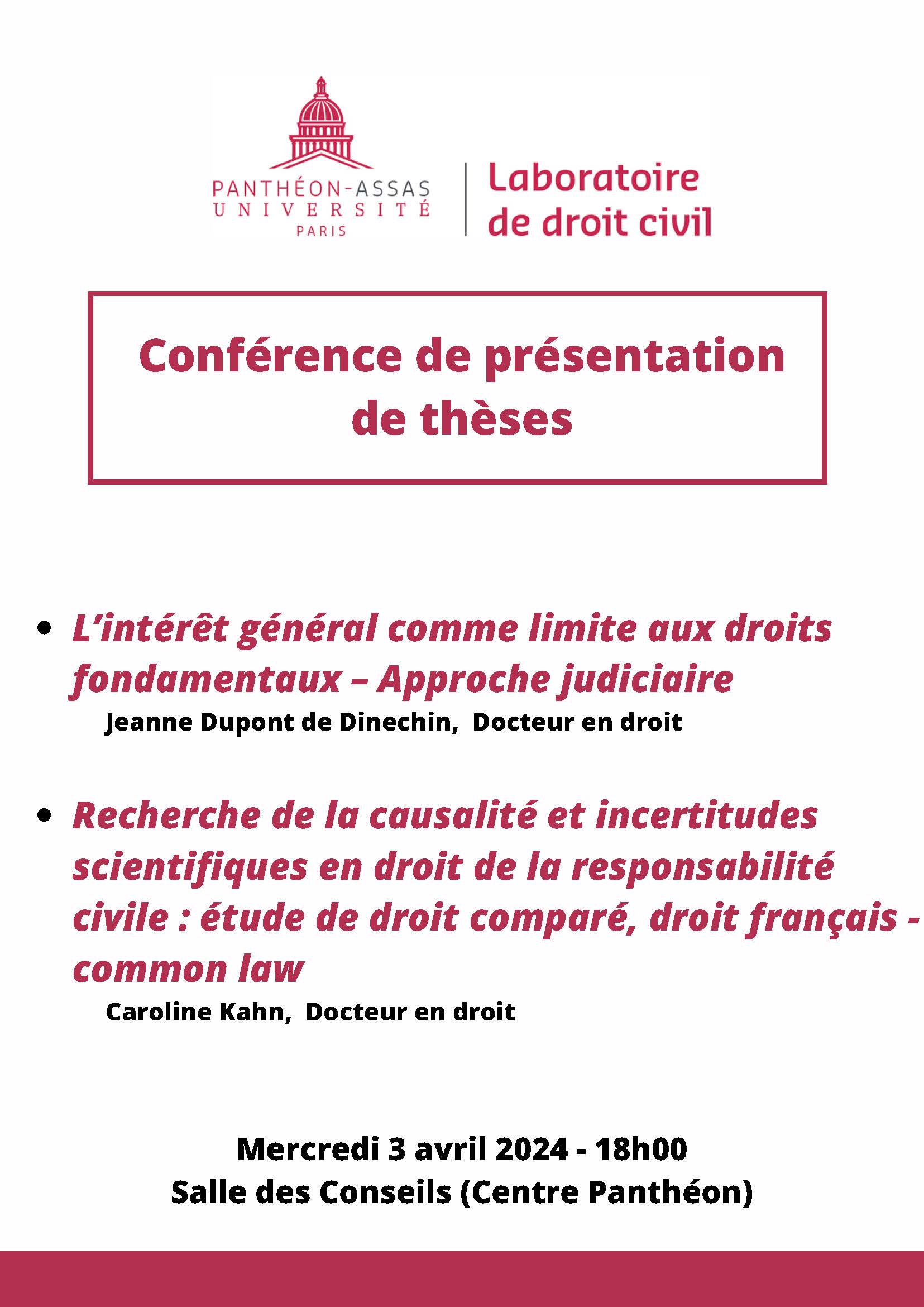 Le laboratoire de droit civil organise une conférence pour la présentation de thèses soutenues au sein du Laboratoire, le mardi 26 mars 2024, au Centre Panthéon.