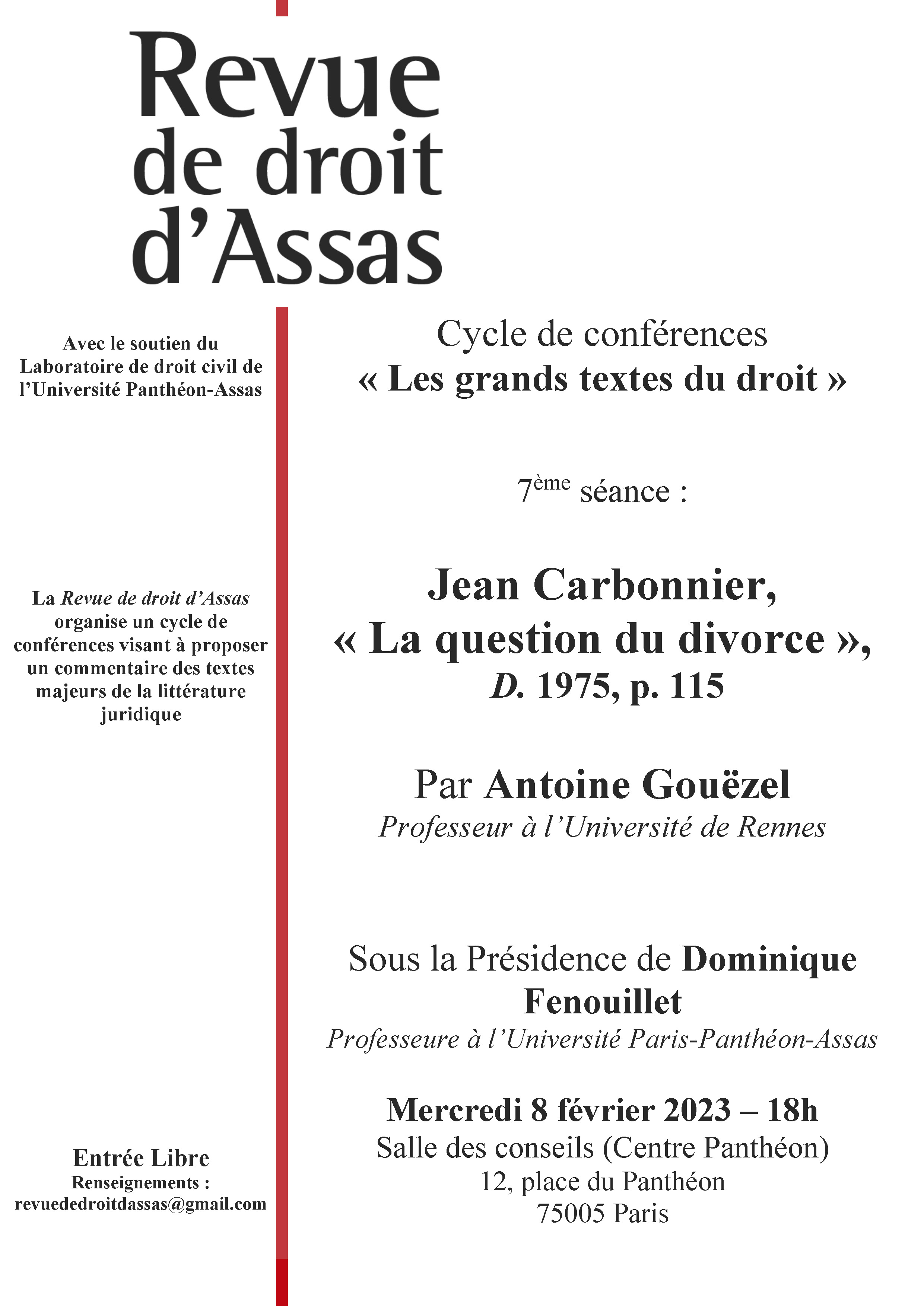 À l'occasion de cette conférence, Antoine GOUËZEL, professeur à l'Université de Rennes commentera un texte de Jean CARBONNIER (J. CARBONNIER, « La question du divorce », D. 1975 p. 115).
